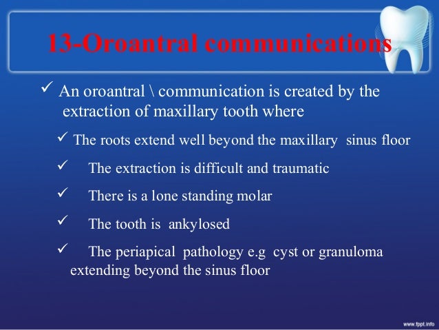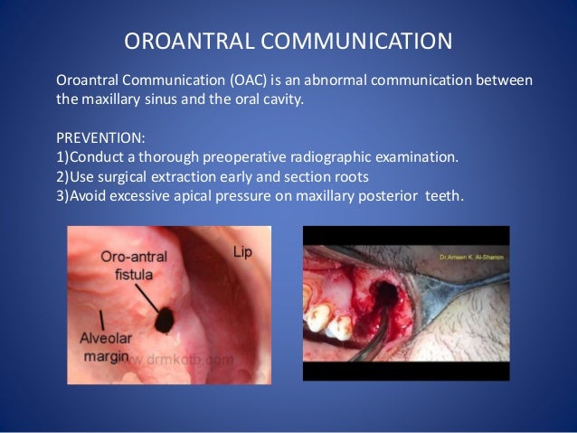 Oroantral fistula (OAF) is an abnormal Spontaneous healing of small perforation is expected to begin about 48 hours after tooth extraction and it remains possible during the If surgical management is to be delayed or contraindicated then an acrylic base plate can be used to support the ... Read Article