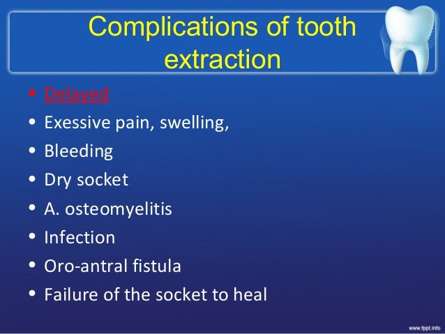 May Dental Extraction Trigger Subacute Thyroiditis ? ABSTRACT Some of the possible complications of tooth extraction/s are pain, excessive and (2013). Complications Following Surgery of Impacted Teeth andTheir Management In: A Textbook of Advanced Oral and Maxillofacial ... Retrieve Here